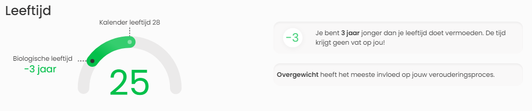 Je biologische leeftijd weerspiegelt je gezondheid en vat de belangrijkste inzichten uit je analyse samen.